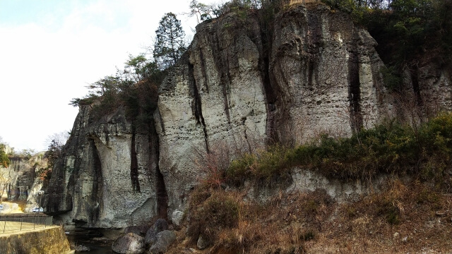 柔らかい性質を持つ大谷石が、長い年月をかけて姿川によって削られ、300メートルにわたって奇岩が重なるような形を作り出しています。この壮大な景観は、大谷石の産地ならではの迫力ある風景です。